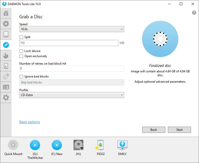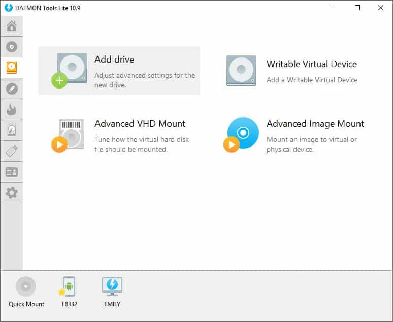 DAEMON Tools Lite は、DVD や CD のコンテンツをハードドライブに保存しながら、データに素早くアクセスできるようにします。システムに最大 4 つの仮想 DVD ドライブを追加して、ディスクイメージの作成と書き込みを開始できます。