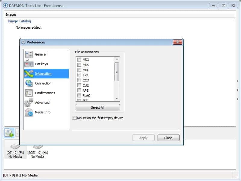 DAEMON Tools Lite の基本的なコントロールはすべてインターフェースツールバーから利用できます。イメージのマウントとアンマウント、そして DT と SCSI の仮想デバイスの追加と削除が可能です。設定ツールを使えば、ホットキーから確認プロンプトまで、あらゆる設定をカスタマイズできます。